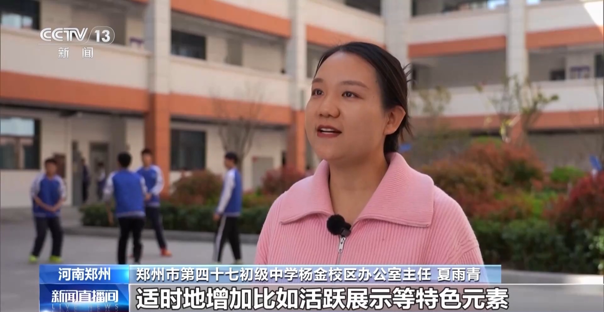 郑州市第四十七初级中学杨金校区办公室主任 夏雨青:下一阶段,我们也将持续丰富大课间的活动内容,适时地增加比如活跃展示等特色元素,切实实践“以体育人、以文化人”的教育初心。